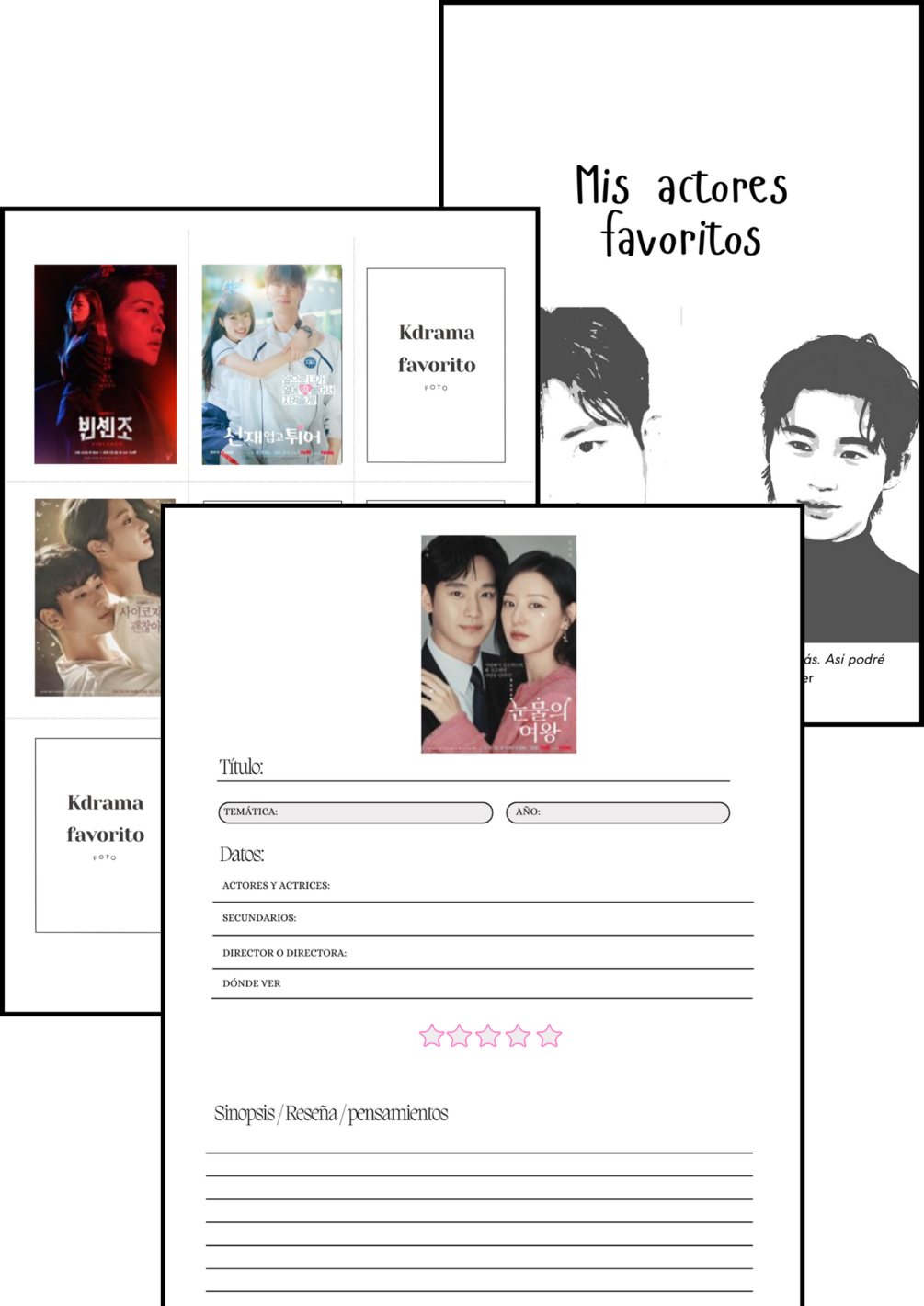 Este diario es para ti, para que puedas anotar tus reseñas, dibujar, pegar fotos de tus series, actores y actrices favoritos... y que te sirva para atesorar esos momentos que te tocan el corazón en algunos kdramas.